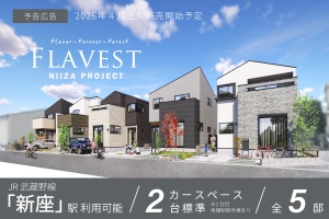 【新発売】 JR武蔵野線『新座』駅徒歩20分、自転車5分(※実測) この便利さは想像以上 新座で叶える、ゆとりある暮らし ◆全5邸 ◆深い軒のフォルムと落ち着いた外壁が、端正で品格ある街並を形成 ◆個性と洗練の表情を生み出す、邸宅感を演出するデザイン ◆全邸建物面積100㎡超のゆとり。LDK17.5帖以上 ◆住まいの満足度を高める12.4~15.6%の収納力